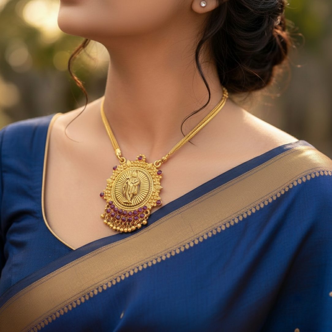Elevate your traditional jewelry collection with this exquisite Divine Lakshmi Gold Pendant Necklace. Crafted with intricate detailing, the pendant features a beautifully embossed Goddess Lakshmi motif symbolizing prosperity and blessings. Surrounded by delicate gold beadwork and accented with rich ruby-colored stones, this necklace radiates timeless elegance. The sleek double-chain design enhances its royal appeal, making it perfect for festive occasions, weddings, and cultural celebrations.