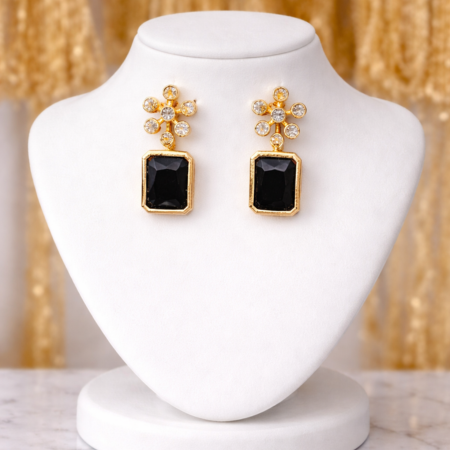 Make a bold and sophisticated statement with the Midnight Royale Geometric Necklace Set. Featuring striking rectangular black stones framed in a rich gold-tone setting, this elegant set blends modern geometry with timeless charm. Delicate floral-inspired gold accents between each stone add a touch of femininity and intricate detailing. Paired with matching stud earrings, this versatile set is perfect for evening parties, festive gatherings, and formal occasions. Its refined contrast of deep black and radiant gold ensures effortless elegance with every wear.
