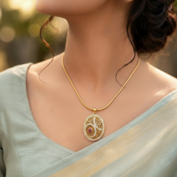 - Elegant gold-toned chain with intricately crafted oval pendant