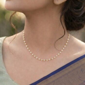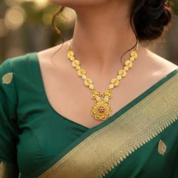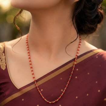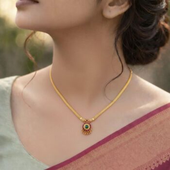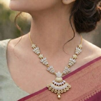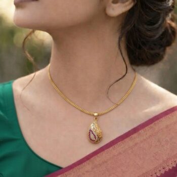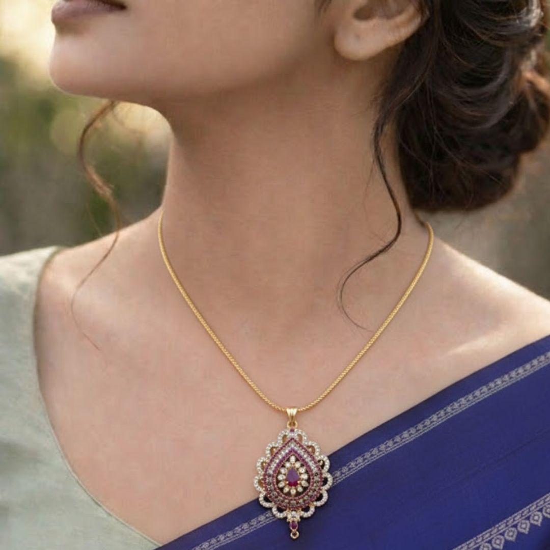 This beautifully crafted necklace features a delicate gold-tone chain paired with a stunning layered pendant design. The pendant is inspired by a floral motif, intricately adorned with shimmering white stones that enhance its brilliance and elegance. At the center, a deep red stone adds a bold and royal touch, making the piece stand out effortlessly. The detailed craftsmanship and balanced proportions create a sophisticated look that complements both traditional and contemporary outfits. Lightweight and comfortable to wear, this necklace is an ideal choice for festive occasions, weddings, parties, or even special evening events, adding timeless charm and grace to your jewellery collection.