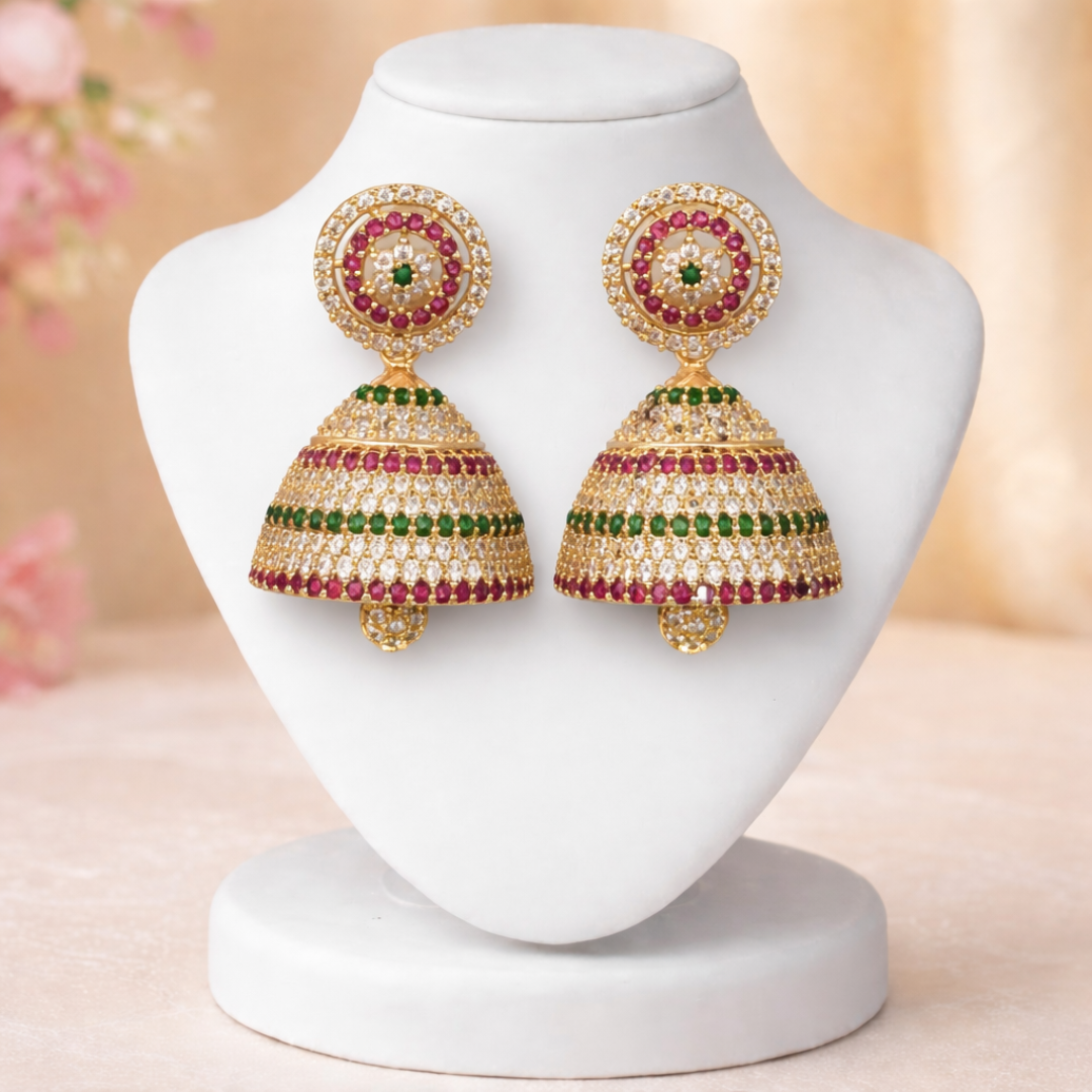 These stunning earrings feature a blend of red and green gemstones, elegantly set in gold, creating a perfect balance of tradition and modern design.